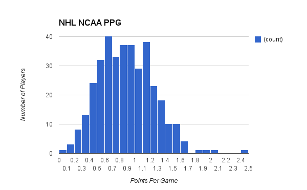 Preemptively, there are a few problems with the following data. There’s a solid twenty years worth of players, and none of the scoring is era-adjusted. That’s where two of the outliers actually do come in– Marty St. Louis, his junior year with Vermont, where he put up 2.43 points per game, and his sophomore year, where he put up 2.03. Scoring in college hockey is actually much lower than in was in the 90s, and while one day I’d like to calculate that, today is not that day. It’s worth noting that the college hockey season is much shorter than the NHL. This dataset also does include players like Mike Brown and John Scott, who it’s easy to say Eichel will be better than.