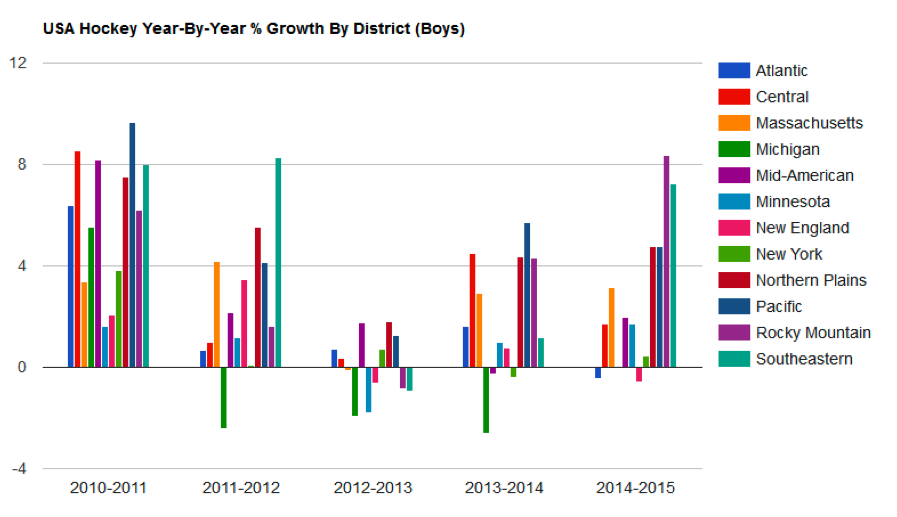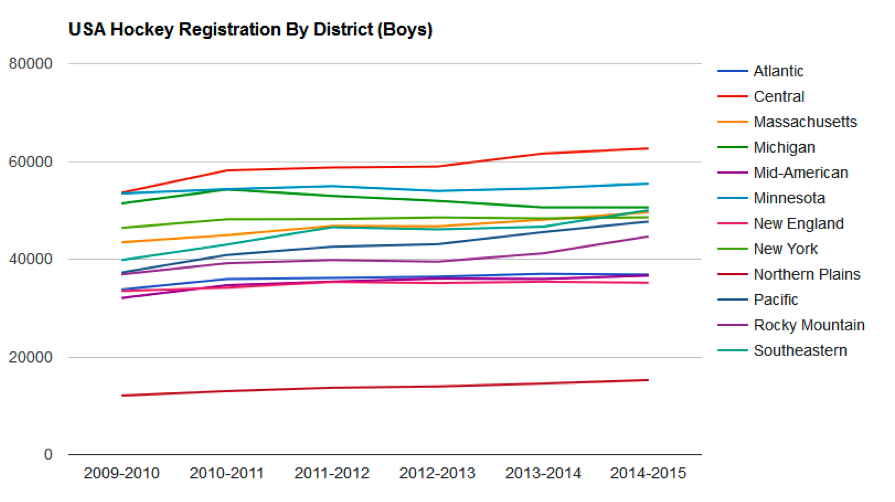 The graphs here show numbers by district over the past five seasons (or the past six, in the initial set of graphs). Numbers by state and age are available via USA Hockey for anyone interested, and Chris Peters did a whole bunch of fantastic posts on the subject back on the United States of Hockey Blog (RIP, USoH). I chose to go with youth hockey numbers over adult numbers because I feel like youth numbers are a better reflection of overall community involvement. It takes a village to raise a hockey player, after all.