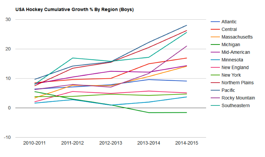 What I wanted to look at, in this impressive upswing of American hockey participation, was: where exactly in these great United States is the growth occurring?
