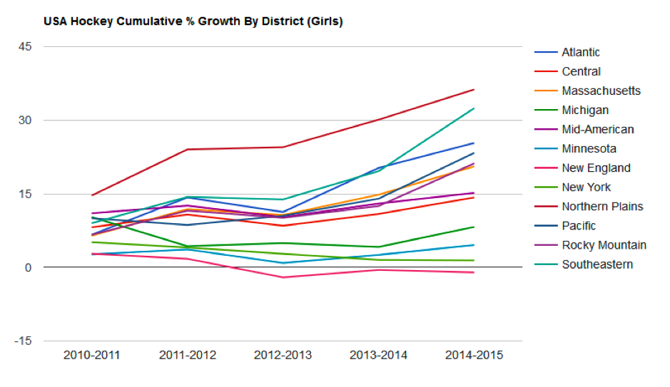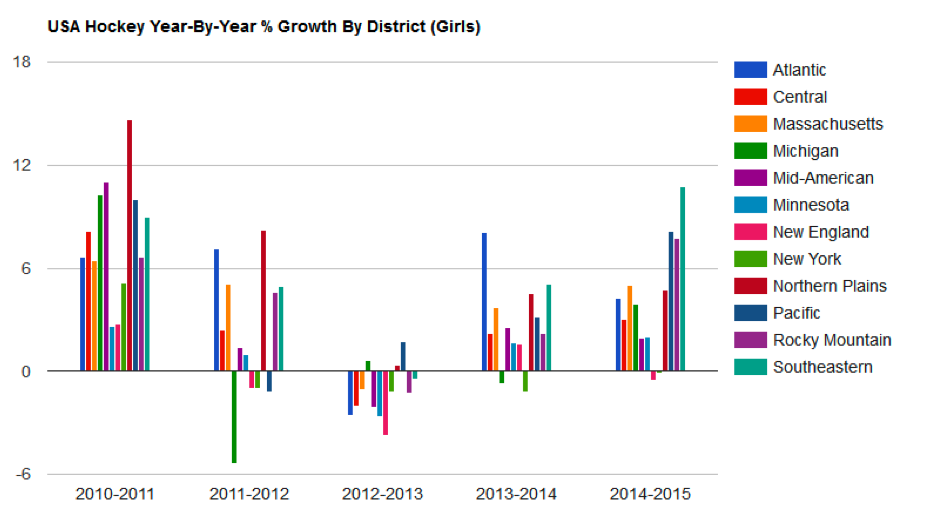 Far more interesting is where other low registration districts show up on these charts: the Northern Plains and Southeastern Districts, both near the bottom on the first set of graphs, have actually experienced the some of the most growth over the past five years. For boys, the Pacific District tops the chart with a 28 percent jump — due in no small part, I’m sure, to the recent success of certain California hockey teams.