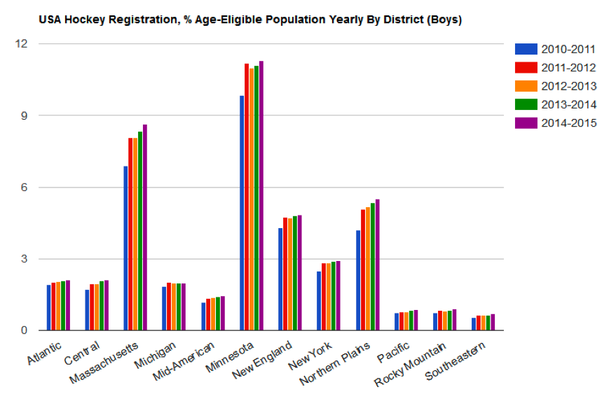 These numbers make it clear why I’m confident saying that hockey is more popular in Minnesota than it is anywhere else in the States. Although the Central District has more overall registered players, a notably higher percentage of kids play hockey in Minnesota than anywhere else. In the 2014-15 season, 11.28 percent of boys and 2.33 percent of girls participated.