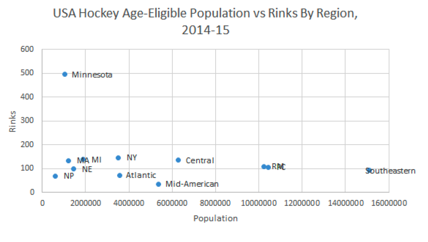 On the other end of the graph is the poor Southeastern, which has one rink for about every 164,000 people in the district, and most of those rinks are located in Florida or the DC area. Massachusetts has one rink per ~9,000 people, but the Pacific District has one per ~97,500.